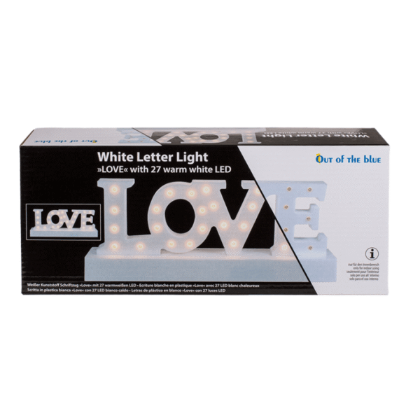 White plastic letter light, Love, with 27 warm white LED, ca. 30 x 12 cm, for 3 mignon batteries (AA) in colour box – Are you still looking for a cosy lighting but at the same time a beautiful decoration? Then this lighting is perfect. With this decoration, you provide a cosy indirect light. The lettering is 30 x 12 cm and consists of 27 warm white LEDs. You need 3 AA batteries for the lighting, which allows you to place the lettering freely without having to limit yourself to sockets. Love light