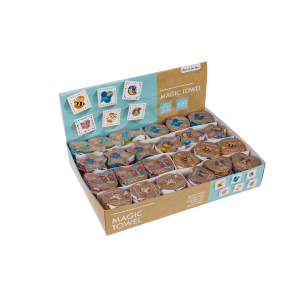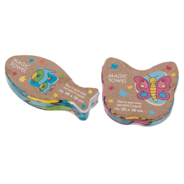 Magic cotton towel, Animals, ca. 30 x 30 cm, 8 ass., 96 pcs. per display – The towel unfolds as soon as the small form is placed in a bowl of warm water. This creates the magic and a small cotton towel appears.The material is cotton and thanks to the motifs, there is the right one for everyone! The towels are ideal as a towel to go or as a small gift to loved ones. Magic towel
