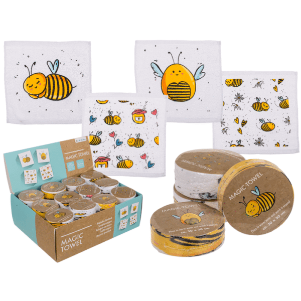 Magic cotton towel, Bee, ca. 30 x 30 cm, 4 assorted, 48 pcs per display – Magic towel