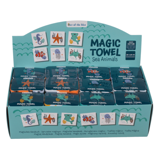 Magic cotton towel, sea animals, 30 x 30 cm, 6 assorted, 48 pcs per display Magic towel
