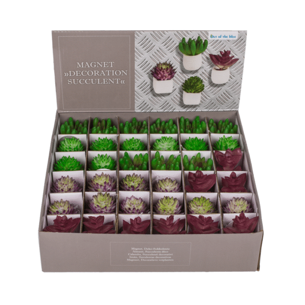 Magnet, succulent in white pot, ca. 3 x 5 cm, 4-ass., 36 pcs in display box – These little succulents will make your surroundings look greener! The white pots in which the plants are placed have a small magnet with which the decorative succulents can be attached to surfaces. This makes the small pots ideal for hanging small notes and photos on the fridge. And the good thing is that you don’t need a green thumb! Succulent magnet