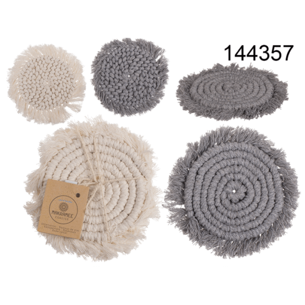 Makramee Coaster, Set of 2, 2 colors ass., D: ca. 10 cm, 80% cotton & 20% poliester, 12 sets per polybag – Skilfully showcase your coffee or other drinks with these makramee coasters! The drink coasters in cotton & polyester not only protect your table from unwanted stains, but are also a real eye-catcher at any party. Each set contains 2 of the fabric coasters and are an ideal gift for all Boho lovers! Bohemian Coasters