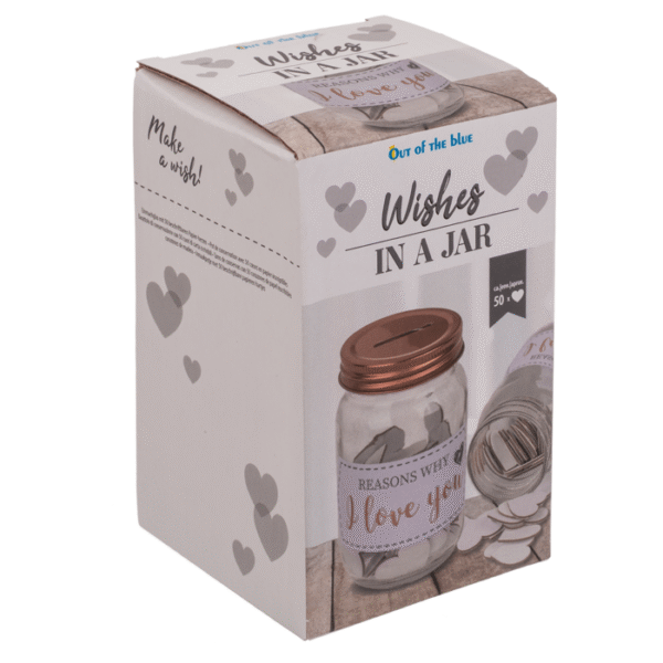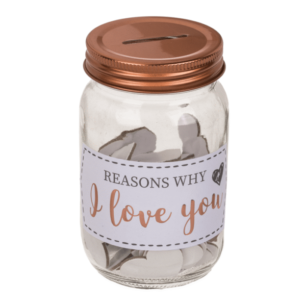 Mason jar, Reasons why I love you, ca. 12 x 7,5 cm, with 50 writable paper hearts, in gift box – Love notes
