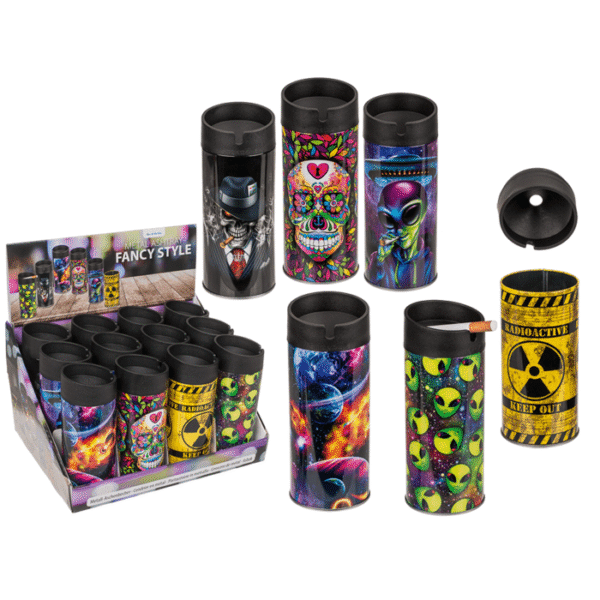 Metal ashtray, Fancy Style, D: ca. 7 cm, 6 ass., 12 pcs. per display – The ashtray has a slot at the top where you can also clip in the cigarette and a small hole where you can then put in your smoked cigarette. To empty the ashtray, you only need to unscrew the upper plastic lid and the ashtray can be easily cleaned. The ashtray is perfect for outdoor use, as the ashes are not stirred up by windy environments. Metal ashtray