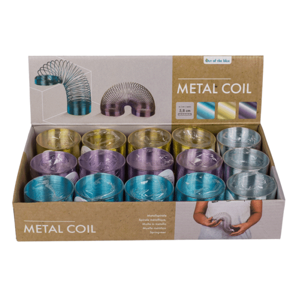 Metal Coil, ca. 5, 8 cm, 4 colours ass., 15 pcs. per display – The spiral is also called a stair climber. If you put it on the top step of the stairs and give it a little push, it runs merrily down the stairs. The metal coil is approx. 5,8 cm tall. The toy is a fun pastime and calming to watch. Metal Coil