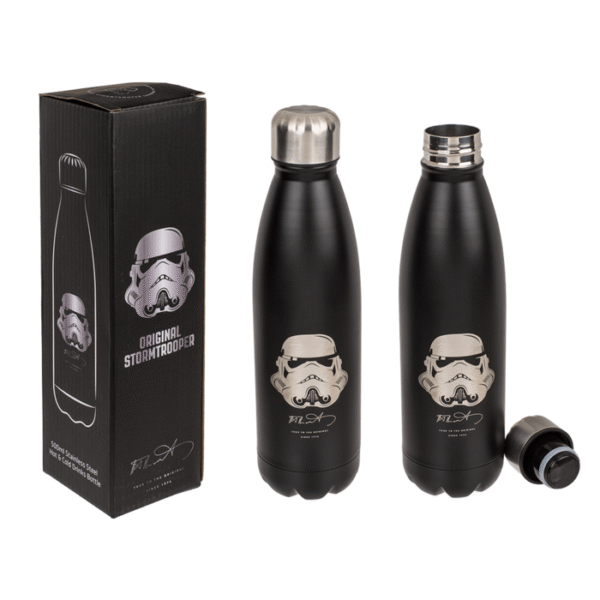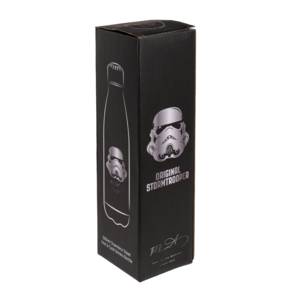 Metal drinking bottle, Stormtrooper I, for ca. 500 ml, H: ca. 27 cm, in gift box – The drinking bottle with its Stormtrooper is ideal for lovers of Star Wars! The metal bottle contains a metal lid and is therefore not only reusable, but also extremely practical! The bottle has a capacity of approx. 500 ml and is ideal togo, whether for school, hiking or work! Stormtrooper