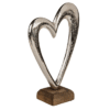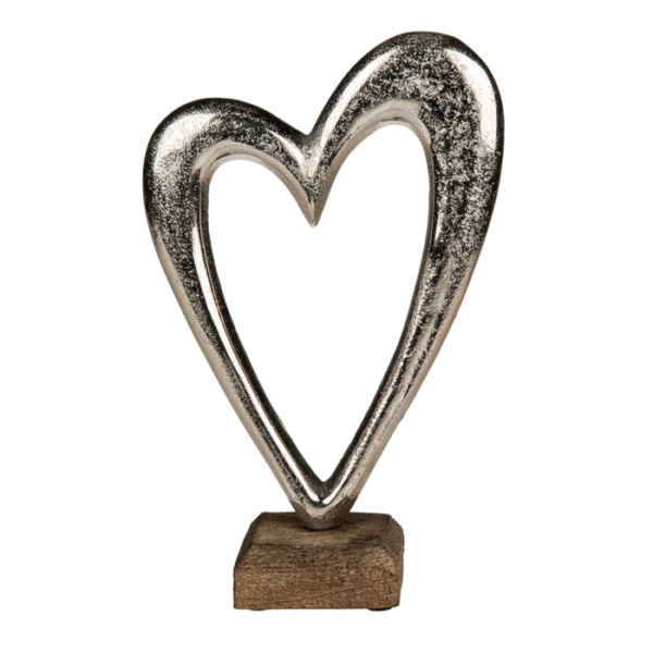 Metal heart on sleeperwood base, ca. 22 cm – The silver-coloured polyresin figure on a wooden stand is a pretty decorative element that provides beautiful lighting effects. The heart is brought to life by its asymmetrical shape and blends into any home decor thanks to the modern and classic style. The wooden base additionally gives the small figurine a rustic look. Heart decor