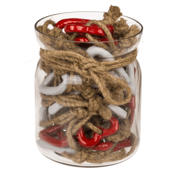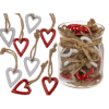Metal hearts with jute rope, 10 x 10 x 12cm, red and white assorted, 30 pcs in glass jar Metal hearts