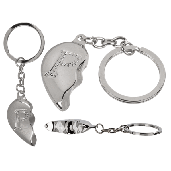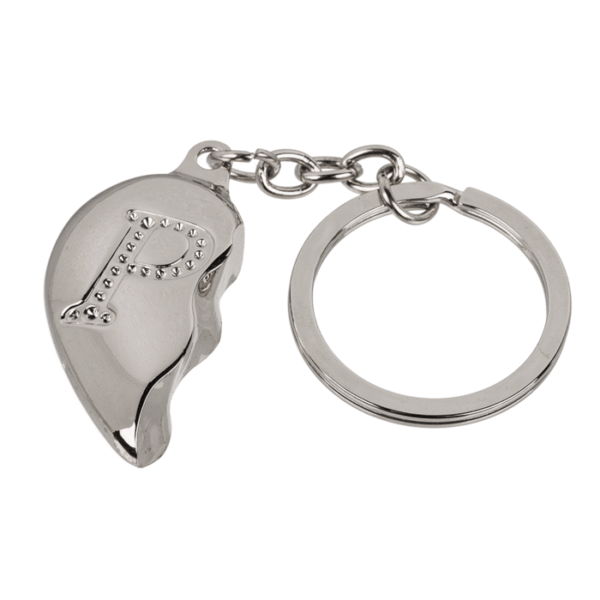 Metal Keychain, Broken Heart, Letter P (duplex) – The elegant key ring with the engraved letter P is a lovely ornament for your key ring. The shape of the broken heart also symbolises the addition of a second half and is therefore ideal as a gift for your partner to show that only with the second side does a whole heart come into shape. The silver coloured key chain is made of metal. Heart Keychain