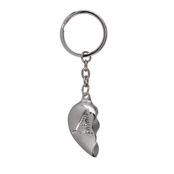 Metal Keychain, Broken Heart, Letter A (duplex) – The elegant key ring with the engraved letter A is a lovely ornament for your key ring. The shape of the broken heart also symbolises the addition of a second half and is therefore ideal as a gift for your partner to show that only with the second side does a whole heart come into shape. The silver coloured key chain is made of metal. Heart Keychain