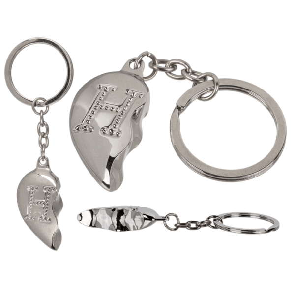 Metal Keychain, Broken Heart, Letter H (duplex) – The elegant key ring with the engraved letter H is a lovely ornament for your key ring. The shape of the broken heart also symbolises the addition of a second half and is therefore ideal as a gift for your partner to show that only with the second side does a whole heart come into shape. The silver coloured key chain is made of metal. Heart Keychain