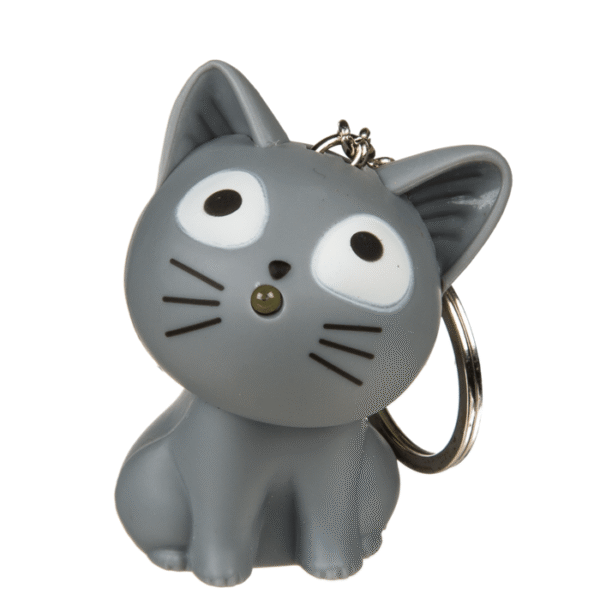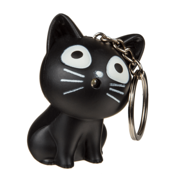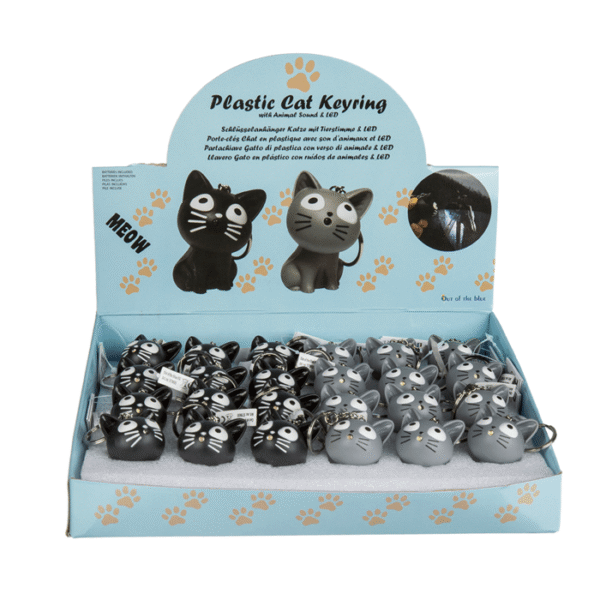 Metal keychain, Cat with animal sound & LED (incl. batteries) ca. 5 cm, plastic, 2 colours ass., 24 pcs. per display – This fantastic keychain is a must-have for all cat lovers! The cute kitty is battery operated and can meow at the touch of a button & it even includes a small LED light to help you find something in your pocket. The batteries for the keychain are included in the delivery. Metal keychain