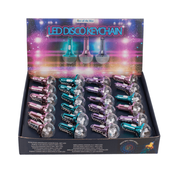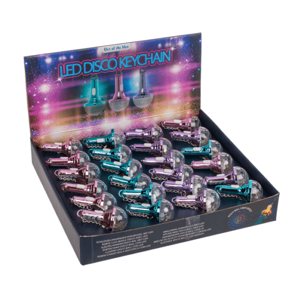 Metal keychain, Disco ball, with LED (incl. batteries) approx. 5 cm, 3 colours ass., 24 pcs. per display Metal keychain