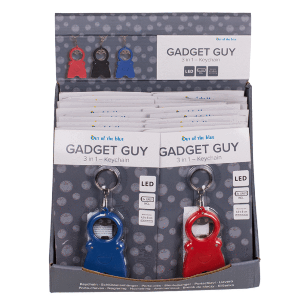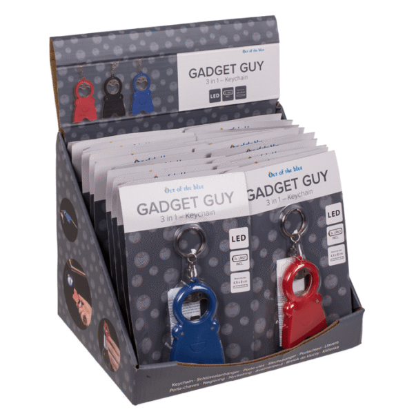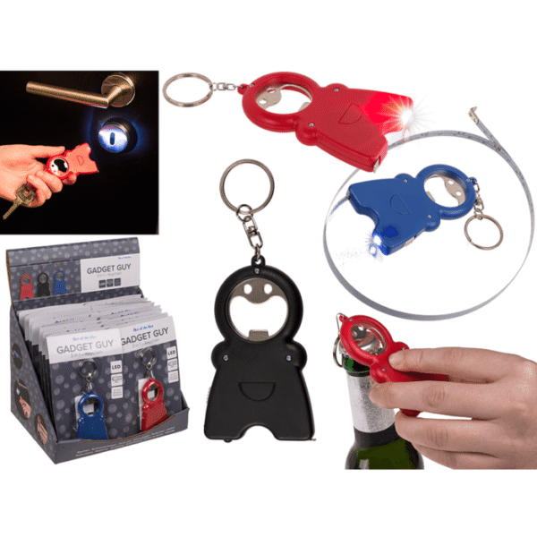 Metal keychain, Gadget Guy – 3 in 1, with bottle oppener, torch & measuring tape, approx. 4,9 x 8 cm, 3 colours ass., on blistercard, 24 pcs. per display Keychain