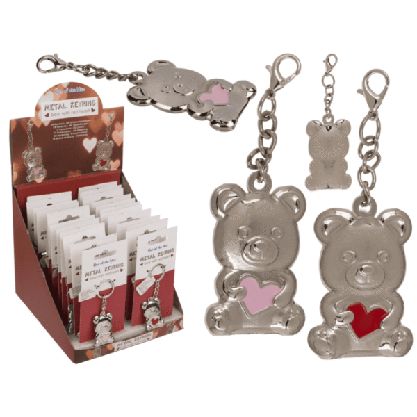 Metal keyring, bear with red heart approx. 4.4 x 2 cm, 24 pieces in display – Keychain Bear Heart Red Gift