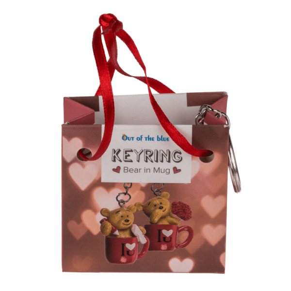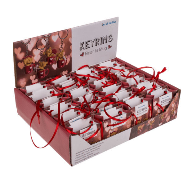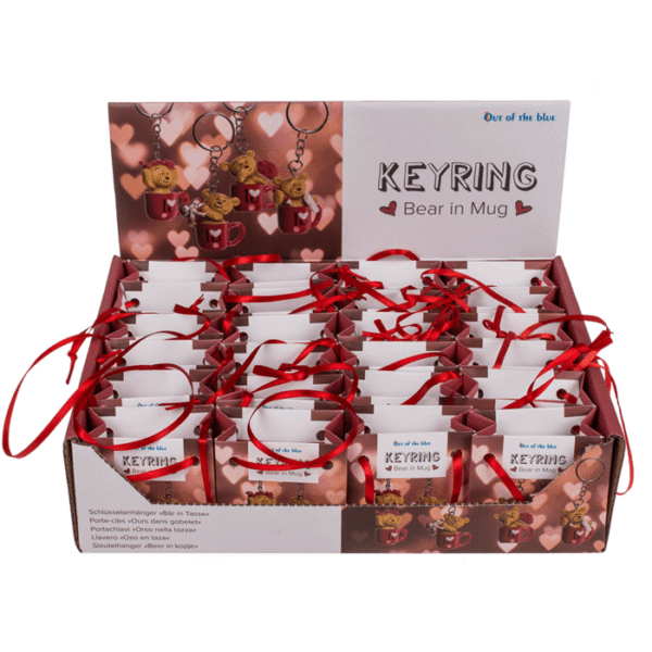 Metal keyring, polyresin bear in mug, ca. 4 cm, 4 ass., in gift bag, 24 pcs. per display – The cute little teddy bear pendants in a cup are ideal to show your partner how much you love them! The key rings are ideal to make your partner smile on Valentine’s Day or on anniversaries. The key rings have a size of approx. 4 cm. The polyresin keychains are packed in a small gift bag and are therefore ready to be gifted. Keychain
