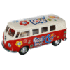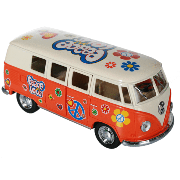 Metal model car with pull back, VW T1 Bus 1962 -, Peace & Love, ca. 12,5 cm, 4 colours ass., 12 pcs per display – Our model car has the ideal size for the children’s room! The car has a pull-back motor and is made of metal with plastic details. The VW toy is perfect as a small giveaway or as a cake topper for the birthday cake. Collectors in particular will learn to love the model car! Metal model