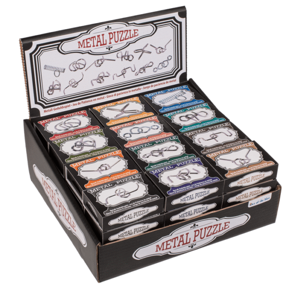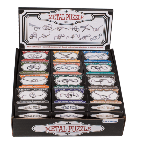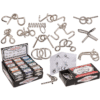 Metal puzzle, Mini, ca. 7cm, 12 ass., 48 pcs. per display – The knotted metal shapes are definitely a challenge! In this mini puzzle, various metal elements have to be detached from each other. The puzzle is therefore the perfect pastime during long waiting times or on long journeys. The game is easy to transport thanks to its compact size and matching packaging. Metal puzzle