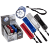 Metal torch with 9 LED, ca. 8, 5 cm, 4 colours ass., for 3 micro batteries (AAA) 16 pcs. per display – The ideal flashlight for late night walks with your dog! It is about 8.5 cm long and available in 4 colors. It is made of metal and has 9 LEDs In the flashlight fit 3 micro batteries (AAA). Through the 9 LEDs it is very bright and can always show you the way in the dark if you can not see anything. And because it is only 8.5 cm, you can easily take it with you. Just pack it in your pocket and get it out quickly. Metal torch