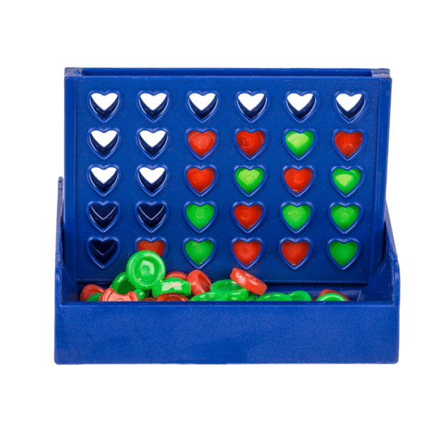 Mini-Games, Four in a row, ca. 6 x 10 cm, 24 pcs per display – This handy 4 in a row game in a small format fits in any pocket and can be taken anywhere. To win, you need a row of 4, whether diagonally as well as in a vertical or horizontal row. The game is set up in no time and the fun lasts at least twice as long! Mini Games