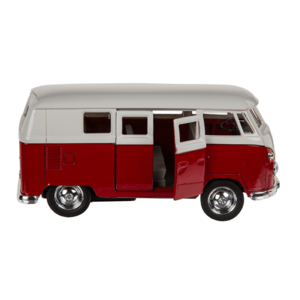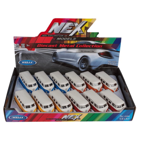 Model car with pull back, VW T1 Bus 1963, plastic with metal, ca. 12 cm, 4 colours ass., 12 pcs. per display – The VW T1 Bus fascinates us all anew every time. Our 1963 Bus has the ideal size for the children’s room! The bus has a pull-back motor and is made of metal and plastic. The detailed toy is perfect as a small giveaway or as a cake topper for the birthday cake. Collectors in particular will learn to love the model car! Collectible