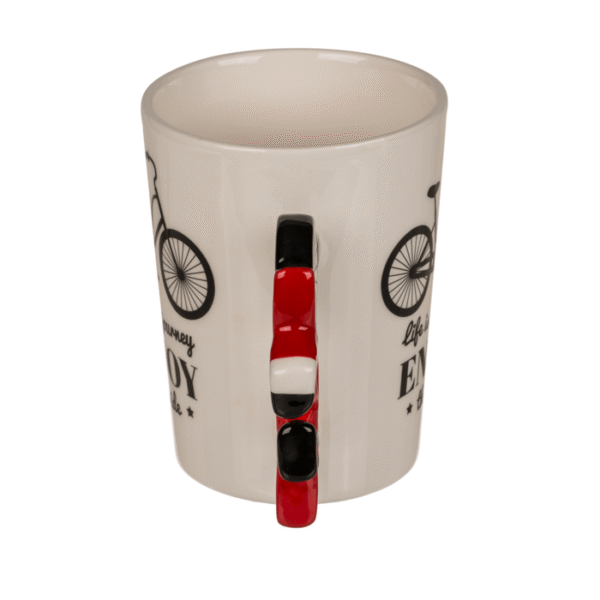 Mug, Bicycle, ca. 12 x 9 cm, ceramic, 2 colours ass. – Life is a journey Enjoy the ride! With this motto, getting up in the morning is as easy as riding a bike! And with this in mind, this mug fits right in! The mug contains a bicycle handle and therefore adds an extra touch that will turn your mug into an eye-catcher. The mug has a capacity of approx. 350 ml. Coffee mug
