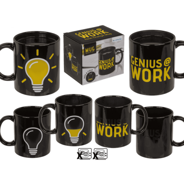 Mug, Genius @ Work, with thermal effect, 9.5 x 8 cm, stoneware, in gift box – Mug Genius at Work mug Heat-changing mug Thermal effect mug Stoneware mug Ceramic gift mug Novelty office mug Funny work mug Gift boxed mug Gift for colleague