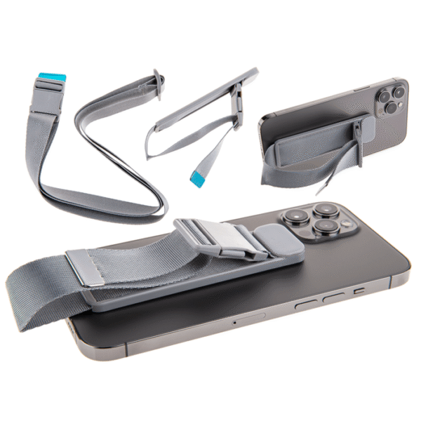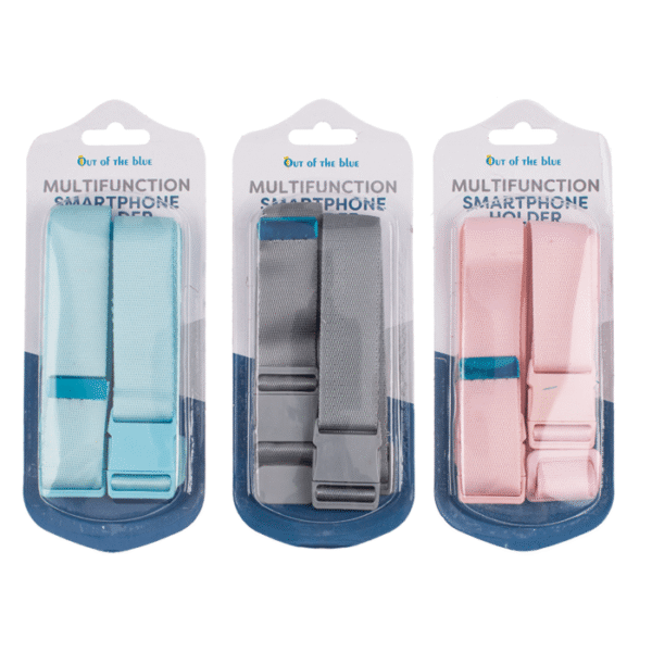 Multifunction phone holder with flexible strap, ca. 2,7 x 31 cm, 6 colours ass., plastic & polyester, set of 2 on blistercard – Phone stand