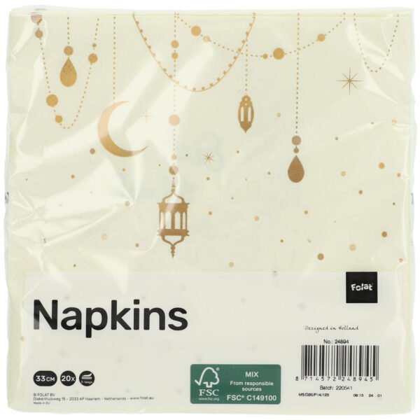 Napkins Eid Mubarak 33x33cm – 20 pieces. Contains: 20 napkins (3-ply) You can use this article for the following party occasion(s): Eid al-Fitr. A napkin is 33x33cm. This article is made of paper.