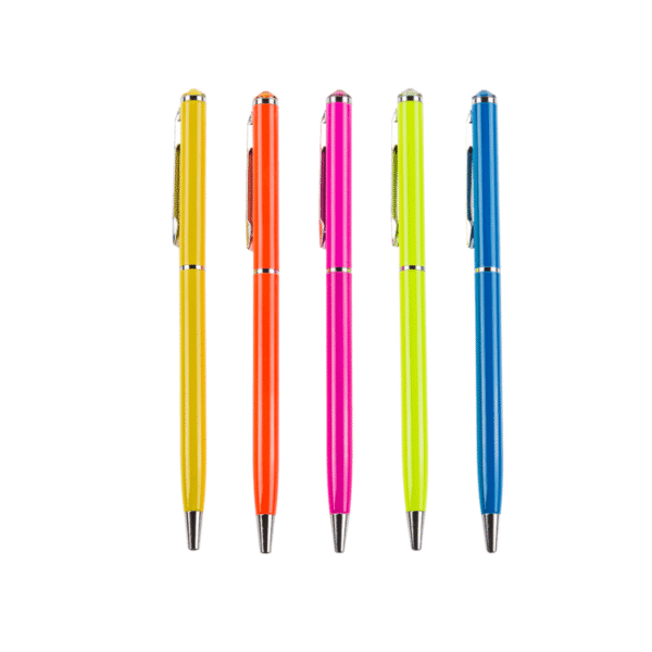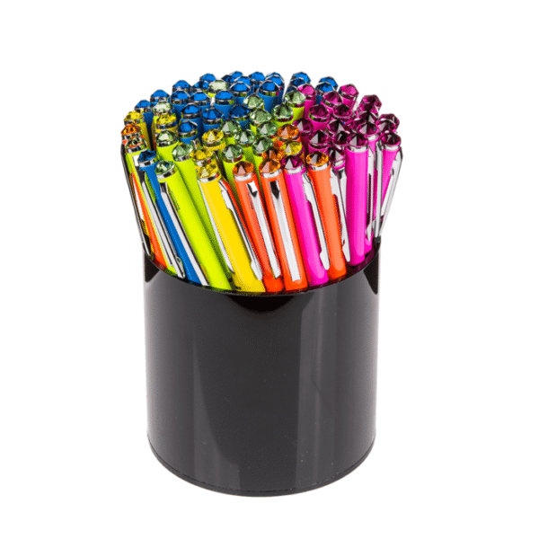 Neon coloured metall pen with Swarovski stone, Neon, 5 colours ass., 72 pcs. with pen holder display – The neon coloured ballpoint pen gives a luxurious look thanks to the Swarovski stone. The pen with twist mechanism can also be hung directly on bags or similar thanks to the clip. Writing on paper also feels pleasantly soft, perfect for school or work! The pen is also suitable as a small gift for surprise bags. Neon pen