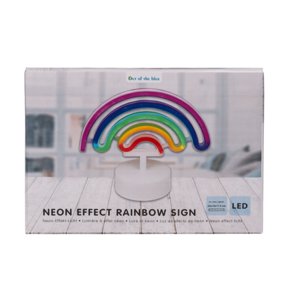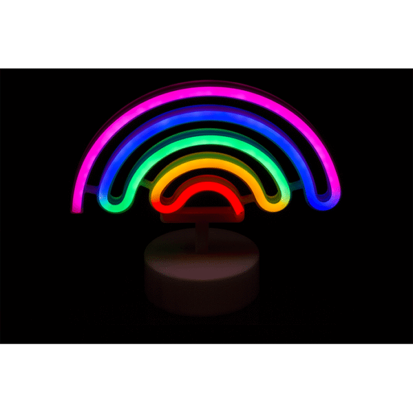 Neon light, Rainbow, ca. 25 x 10 x 17,5 cm, plastic, for 3 mignon batteries (AA) in gift box – Neon lights simply have a magical effect on us and every time a neon sign lights up, you automatically have to look at it! And now you can have it in your own home! This neon effect lamp is ideal for your own home as it is mounted on a stand for easy decoration on pedestals and desks. The lamp runs on 3 AA batteries, which are not included. Neon light