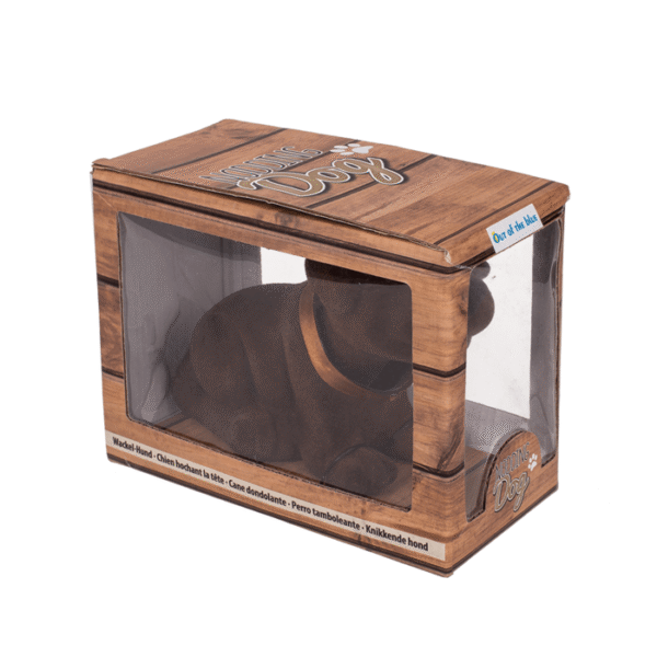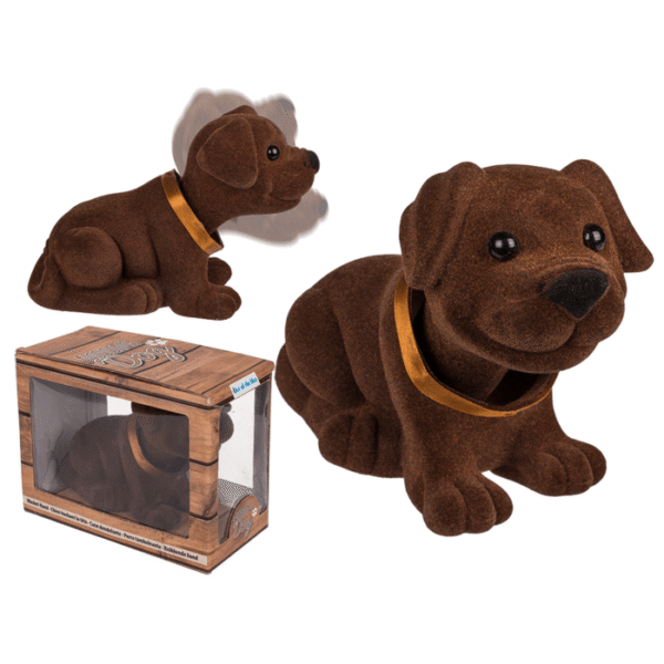 Nodding dog, ca. 20 x 13 cm, plastic, in gift box – A timeless classic! The nodding dogs are faithful companions for decades. Our wiggly dog has an adhesive strip on its belly so that it can be securely fastened to the boot lid or even the desk so that it doesn’t topple over from all the head wobbling. Nodding Dog
