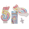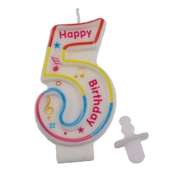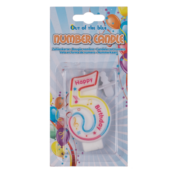 Number candle, 5, ca. 7 x 1 cm, on blister card – The double-sided candle, in the shape of the number 5, is designed in bright colours and the inscription “Happy Birthday”. With the white plastic holder, it can be easily attached to the birthday cake. The individual numbers can be arranged in any combination you like. Seeing the burning candles will delight birthday children of all ages. Birthday candle