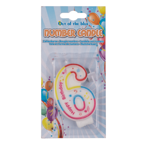 Number candle, 6, ca. 7 x 1 cm, on blister card – The double-sided candle, in the shape of the number 6, is designed in bright colours and the inscription “Happy Birthday”. With the white plastic holder, it can be easily attached to the birthday cake. The individual numbers can be arranged in any combination you like. Seeing the burning candles will delight birthday children of all ages. Number candle