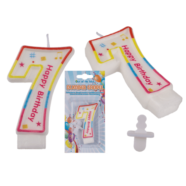 Number candle, 7, ca. 7 x 1 cm, on blister card – The double-sided candle, in the shape of the number 7, is designed in bright colours and the inscription “Happy Birthday”. With the white plastic holder, it can be easily attached to the birthday cake. The individual numbers can be arranged in any combination you like. Seeing the burning candles will delight birthday children of all ages. Birthday candle