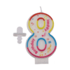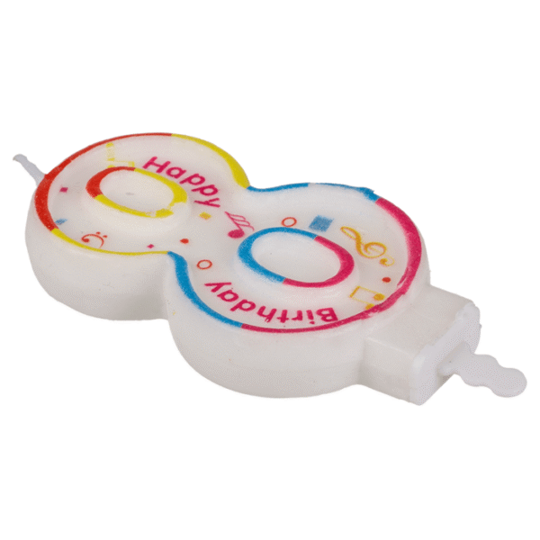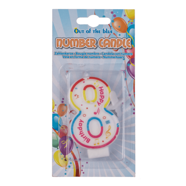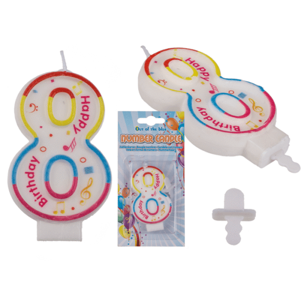 Number candle, 8, ca. 7 x 1 cm, on blister card – The double-sided candle, in the shape of the number 8, is designed in bright colours and the inscription “Happy Birthday”. With the white plastic holder, it can be easily attached to the birthday cake. The individual numbers can be arranged in any combination you like. Seeing the burning candles will delight birthday children of all ages. Birthday candle