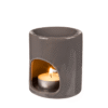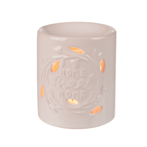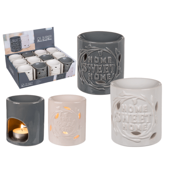 Oil burner, Home Sweet Home, ceramic, ca. 8 x 9 cm, 2 colours assorted, 12 pcs in display – The aroma lamp made of ceramic gives every room a pleasant scent. The cylindrical lamp can be fitted with a tea light at the bottom and has a cavity at the top into which scented oils or melts can be poured. An eye-catcher during the day and a functional oil burner at night! Aromatherapy