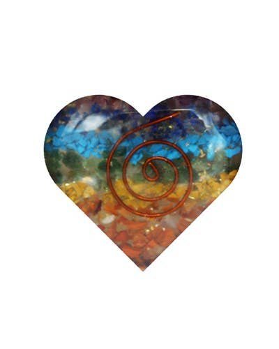An orgonite heart with a copper spiral. The spiral symbolizes the cycle of life. Within the heart you can see chakra gemstones. These seven colors refer to the symbols of each of the chakras.