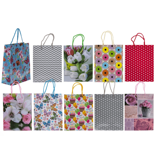 Paper bag III, ca. 18 x 8 x 23 cm, 10 pcs ass. in polybag – A gift is only perfect when it has been thought through to the last detail. Even down to the gift wrapping! With a gift bag you therefore have the perfect detail and wrap the gift in a split second. Not only are they an incredibly quick solution for those who are not that good at wrapping gifts, they can also be reused as often as you like! The paper bags in a glossy finish feature textile handles that make the gift easy to transport. Gift bags
