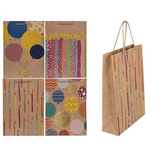 Paper gift bag, ballooons & candles, 25 x 8,5 x 34,5 cm, 4 assorted, 12 pcs in polybag Gift bag