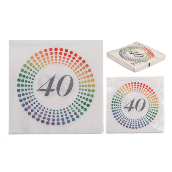 Paper napkins, Birthday – 40, aprox. 33 x 33 cm, 3 layers, 20 pcs. per polybag – Decorate the birthday table in the theme of the achieved milestone with these paper napkins! Each package contains 20 pieces of the three-ply napkins and thanks to the inscription, it’s not hard to see how many candles are on the guest of honour’s cake! The napkins are ideal as gift additions and as decorative elements on the cake table. Party napkins