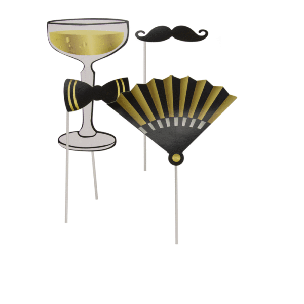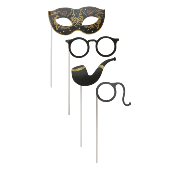 Party photo accessories on stick, New Year (hat, glasses, champagne glas, mustache, etc) set of 12 pcs. in polybag with headercard – The stylish photo accessories are perfect for the Christmas party or New Year’s Eve. The 12 different motifs provide a wide range of creative photos. So you can create unforgettable moments with your beloved ones! Party props