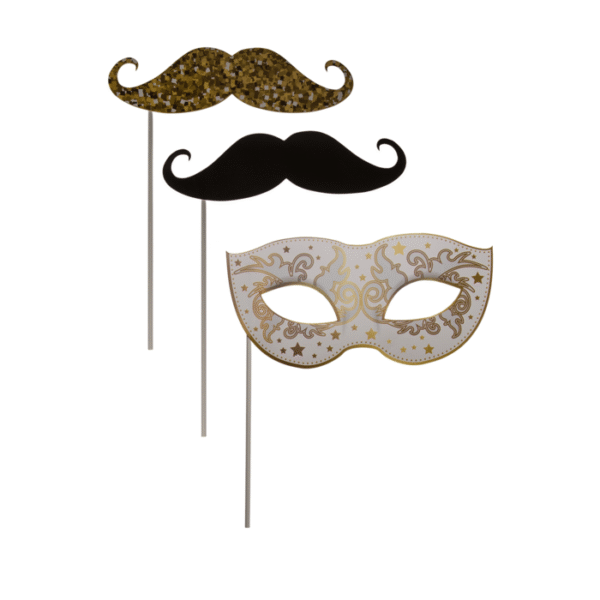 Party photo accessories on stick, Glamour (hat, bow tie, necklace, rose, etc) set of 12 pcs. in polybag with headercard – Spice up your party photos with our fancy accessories! All you have to do is hold the photo accessories on the stick in front of your face and take unforgettable videos and pictures! The sturdy paper ensures that the accessories stay in place. Each package comes with a set of 12 stick accessories in total, so there’s something for everyone! Photo props
