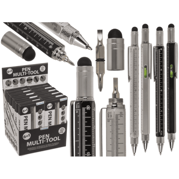 Pen, Multi-Tool, 6 in 1, 15 x 1,5 cm, Pen tool Multi-function Compact size Versatile tool Assorted colors Display pack Handy gadget Portable accessory DIY tool Office essential