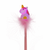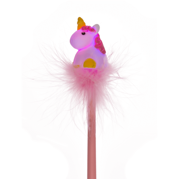 Pen with LED, Unicorn & Pom Pom (incl. batteries) ca. 21 cm, plastic, 2 ass., 24 pcs. per display – The fantastic pen is perfect for unicorn lovers! The pen comes with a little unicorn figurine that can even begins to shine, thanks to the LED light! When writing, the fabulous pen feels very pleasant and soft and it does not scratch the paper. The pens are also suitable as a small gift for surprise bags. LED Pen
