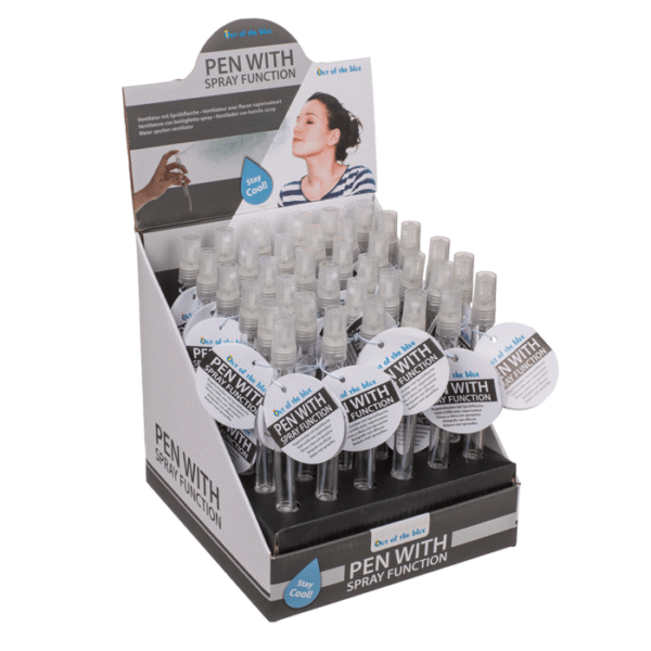 Pen with spray bottle. ca. 7 ml, ca. 18 cm, plastic, 36 pcs per display – The pen is ideal for hot summer days in the office or at school. The integrated spray bottle has a capacity of 7ml. The pen includes a cap to avoid accidentally drawing on unwanted areas. Writing with the ballpoint pen also feels soft and smooth without scratching the writing surface. The pen is also suitable as a small gift for surprise bags. Spray pen