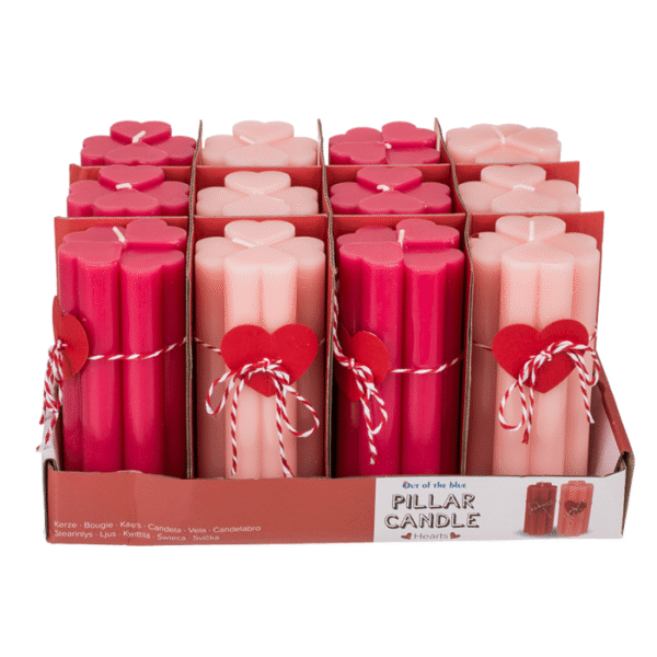 Pillar candle, Hearts, 6 x 6 x 13cm, 2 colors assorted, 12 pcs per tray Heart candle