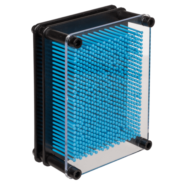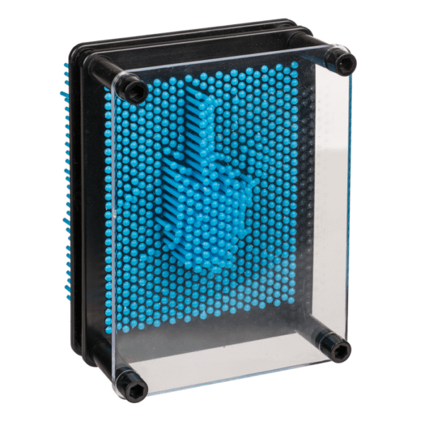 Pin Art, ca. 12 x 9 cm, plastic, 3 colours ass., in giftbox – Create your own 3D sculptures with all kinds of objects. The only thing you have to do is press the objects or your hand, face or maybe even your feet against the back of the board and the little needles move forward. And if you like your sculpture, you can even place it on your desk or something similar. Of course, you can also remake your sculptures countless times. Pin Art