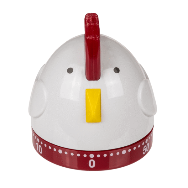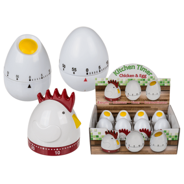 Plastic timer, Egg & Chicken, ca. 8 x 7 cm, 3 ass., 12 pcs. per display – The charming egg timer is a real kitchen saviour! The plastic timer can be set up to 59 minutes high and therefore helps you to ensure that your dishes get exactly the cooking time you desire so that you don’t completely forget your food and then burn it. The ticking timer in chicken & egg design offers functionality and a fun design at the same time! Kitchen timer