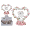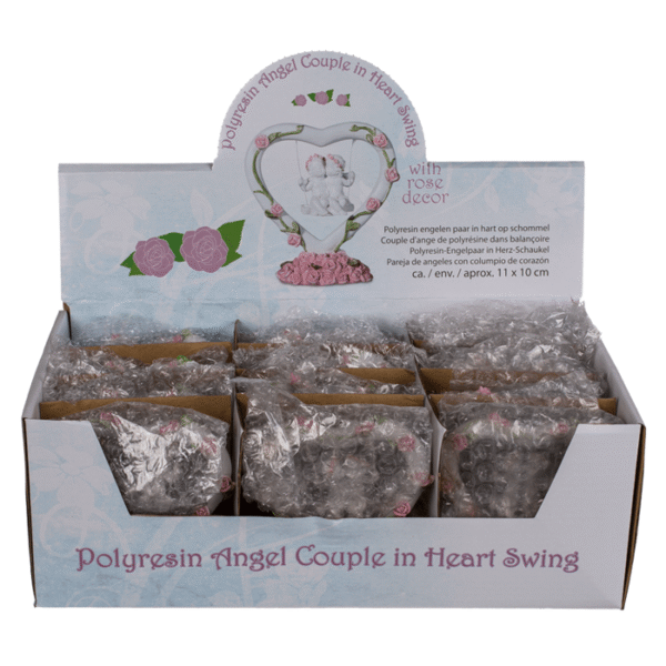 Polyresin angel couple in heart swing with pink, coloured rose decor, ca. 11 x 10 cm, 12 pcs per Display – The lovingly designed angel figurines exude a calm and secure feeling, which come into their own excellently as a decorative element. The heavenly companions in polyresin leave a positive effect in the environment and make an excellent gift straight from the heart. This angel couple in their lovely heart swing are perfect for hostess gifts, such as weddings. Angel figurine